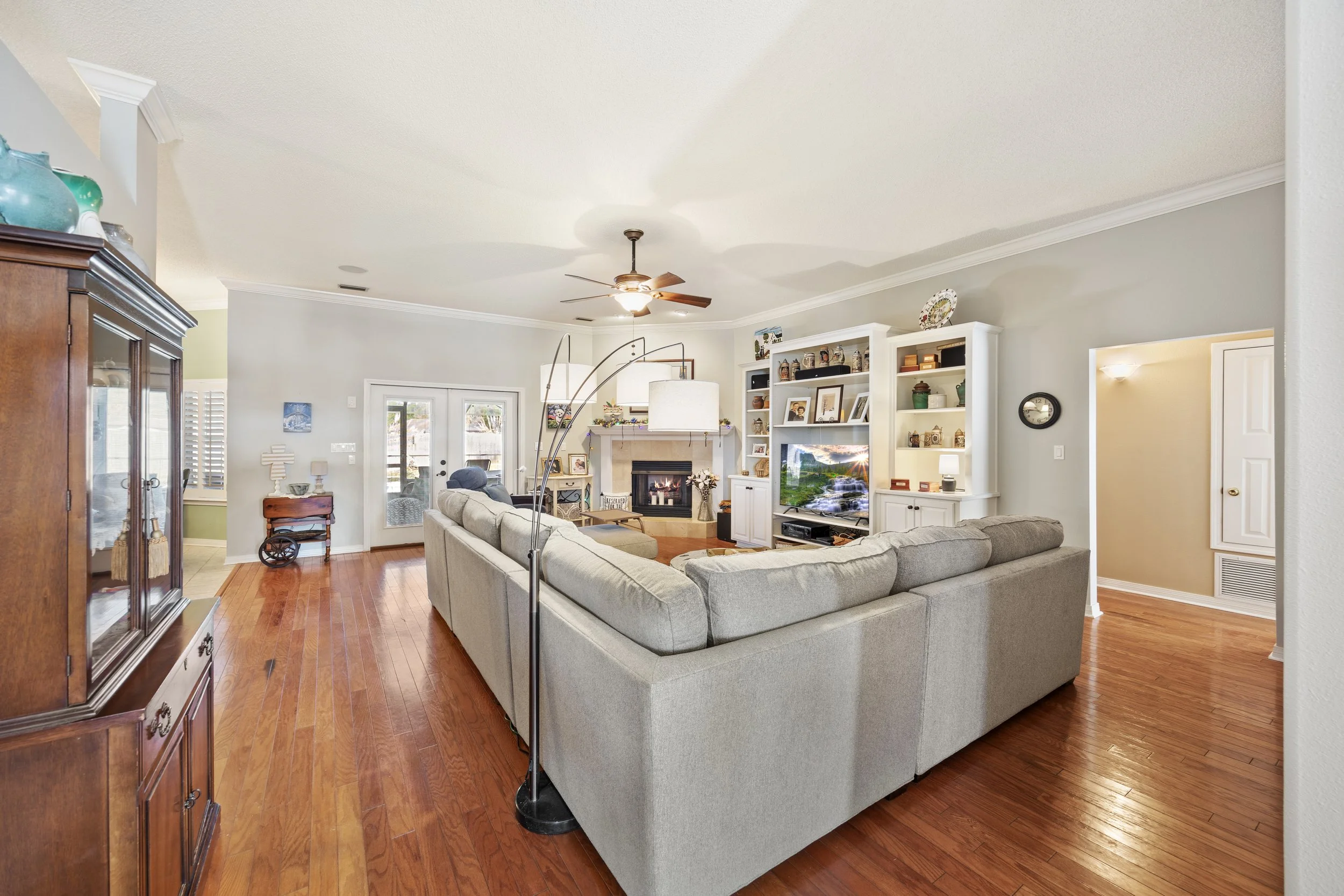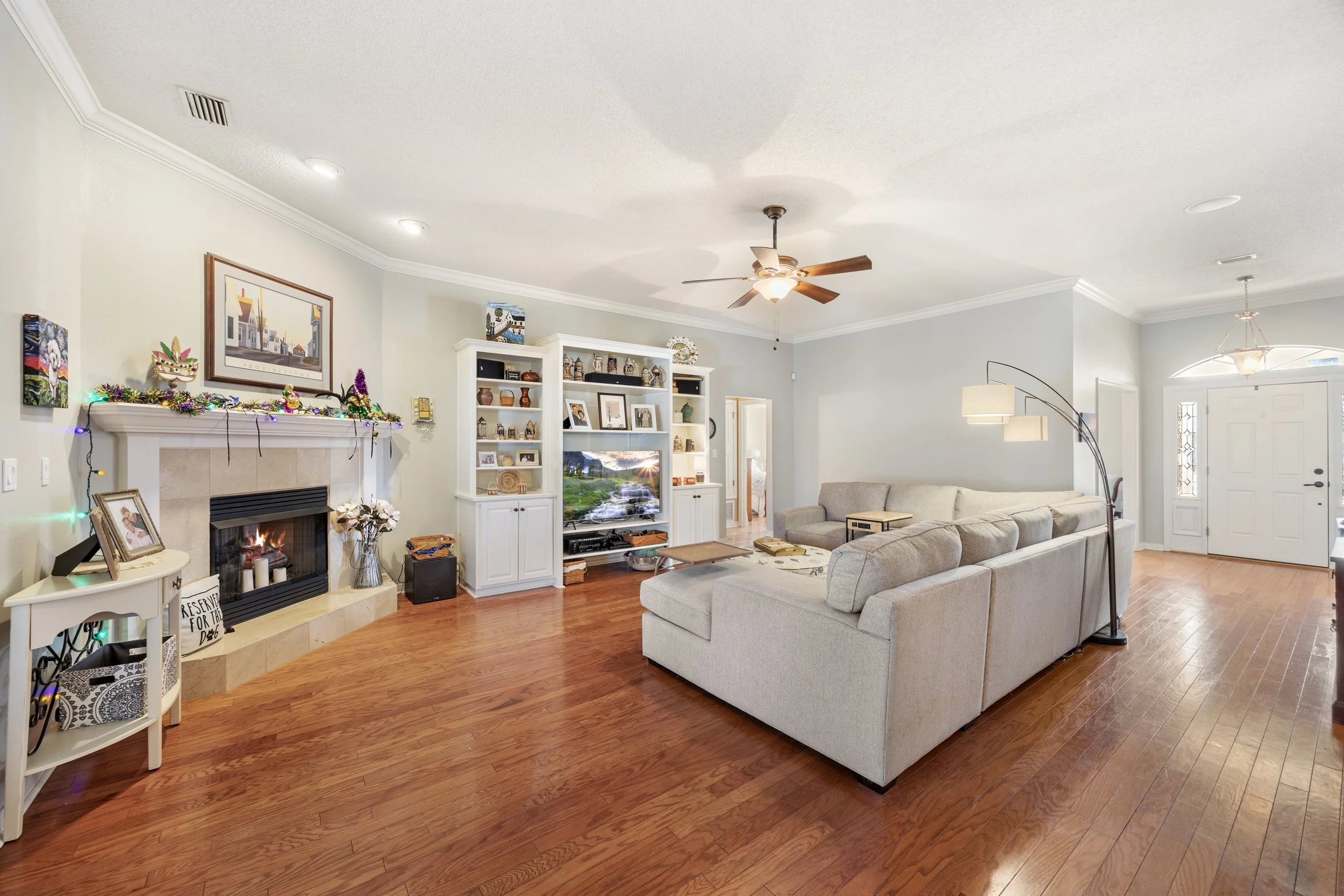 From the moment you arrive, the large front porch creates a welcoming first impression and sets the tone for what’s inside. Step through the front door and you’ll find hardwood flooring throughout the main living areas, a formal dining room for gathering, and a flexible office or bonus space that can adapt to your needs. The living room is spacious and inviting, anchored by a propane fireplace and built-in cabinets and shelving that add both character and functionality.