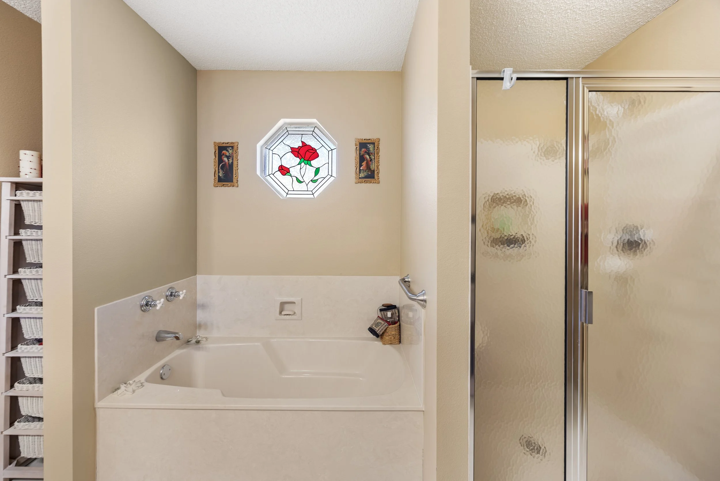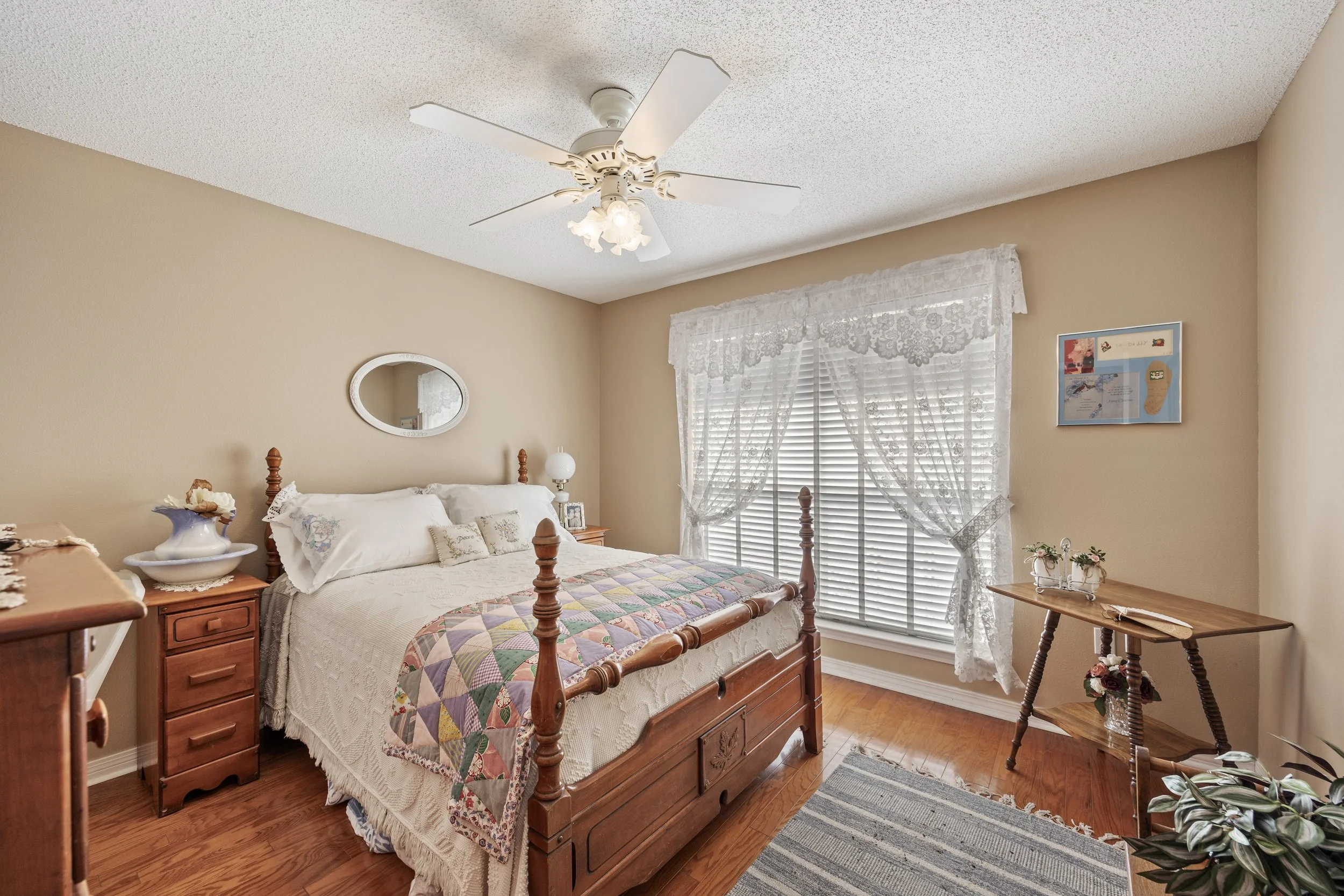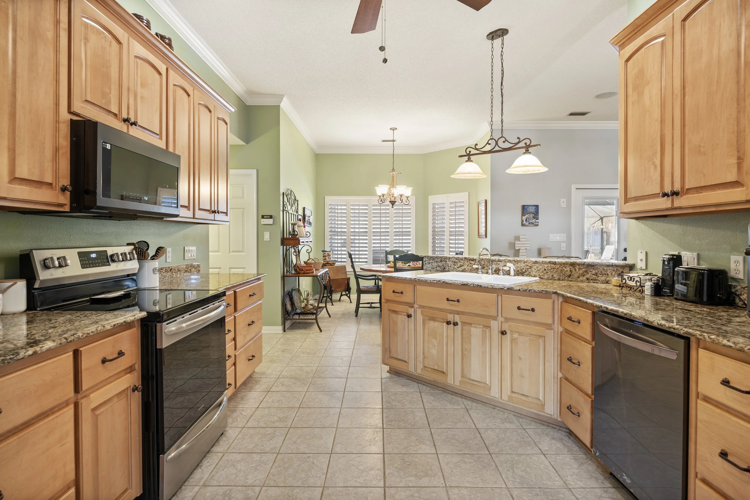The kitchen is designed for everyday living and hosting alike, featuring real wood cabinetry, granite countertops, a farm sink, newer stainless steel appliances, a pantry, and a breakfast nook overlooking the backyard. Plantation shutters throughout the home add a finished, timeless feel while giving you control over light and privacy.