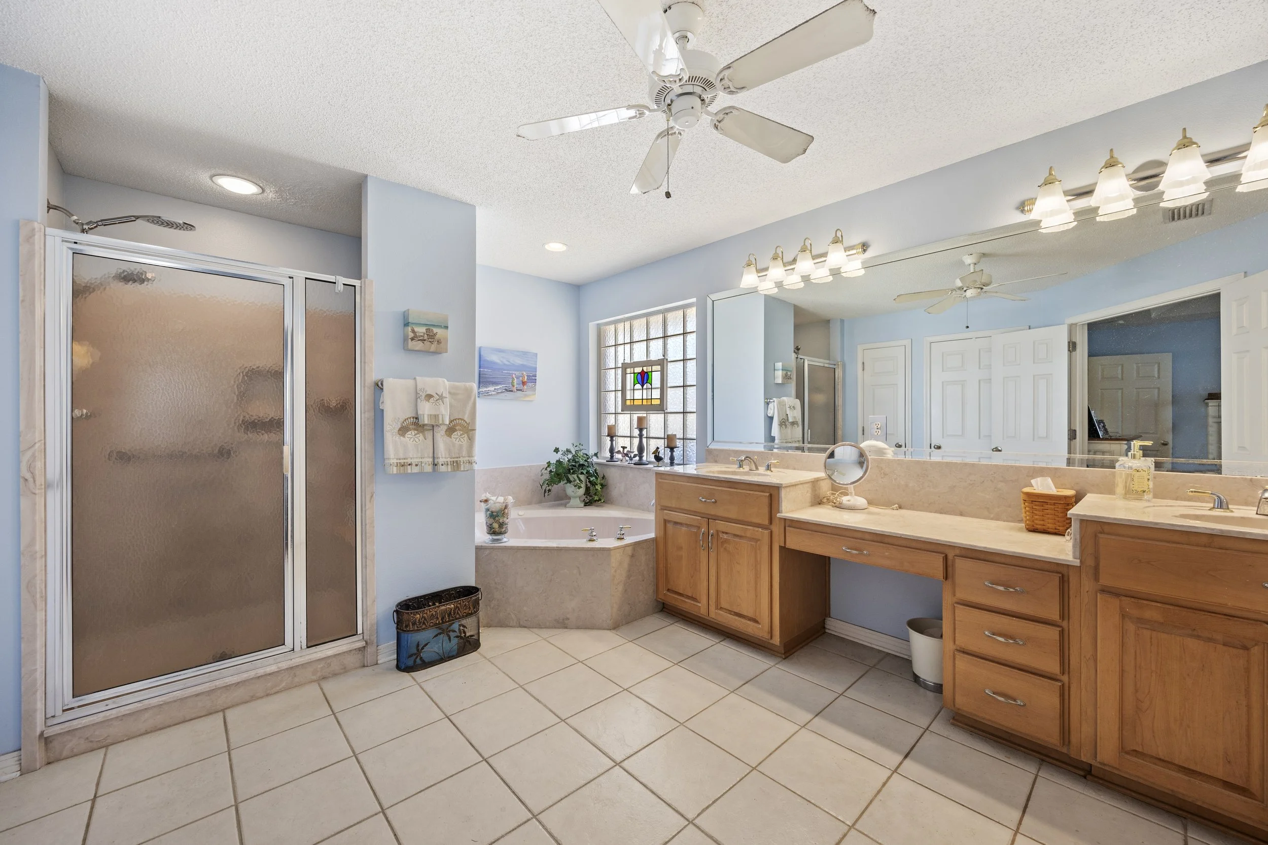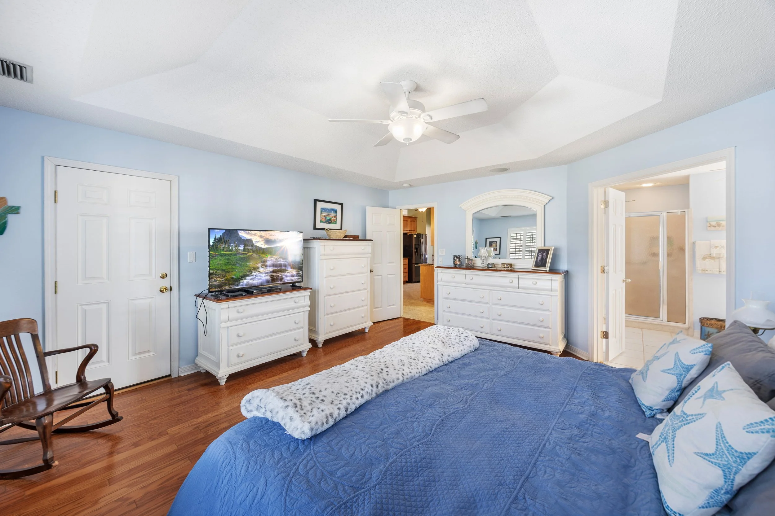 The primary suite is a true retreat with a tray ceiling and plenty of space to unwind. The attached bathroom includes a soaking tub, separate shower, double vanities, a walk-in closet, and a linen closet. Two additional bedrooms are generously sized and connected by a Jack-and-Jill bathroom with both a large tub and a separate shower, making it ideal for guests or family.