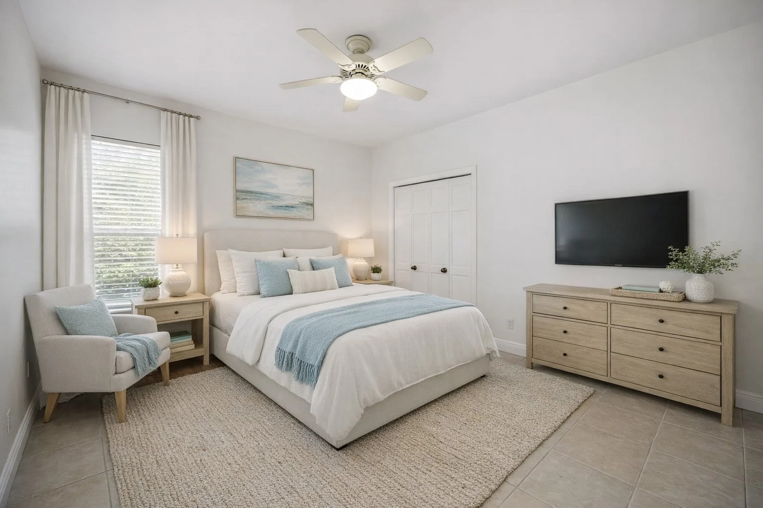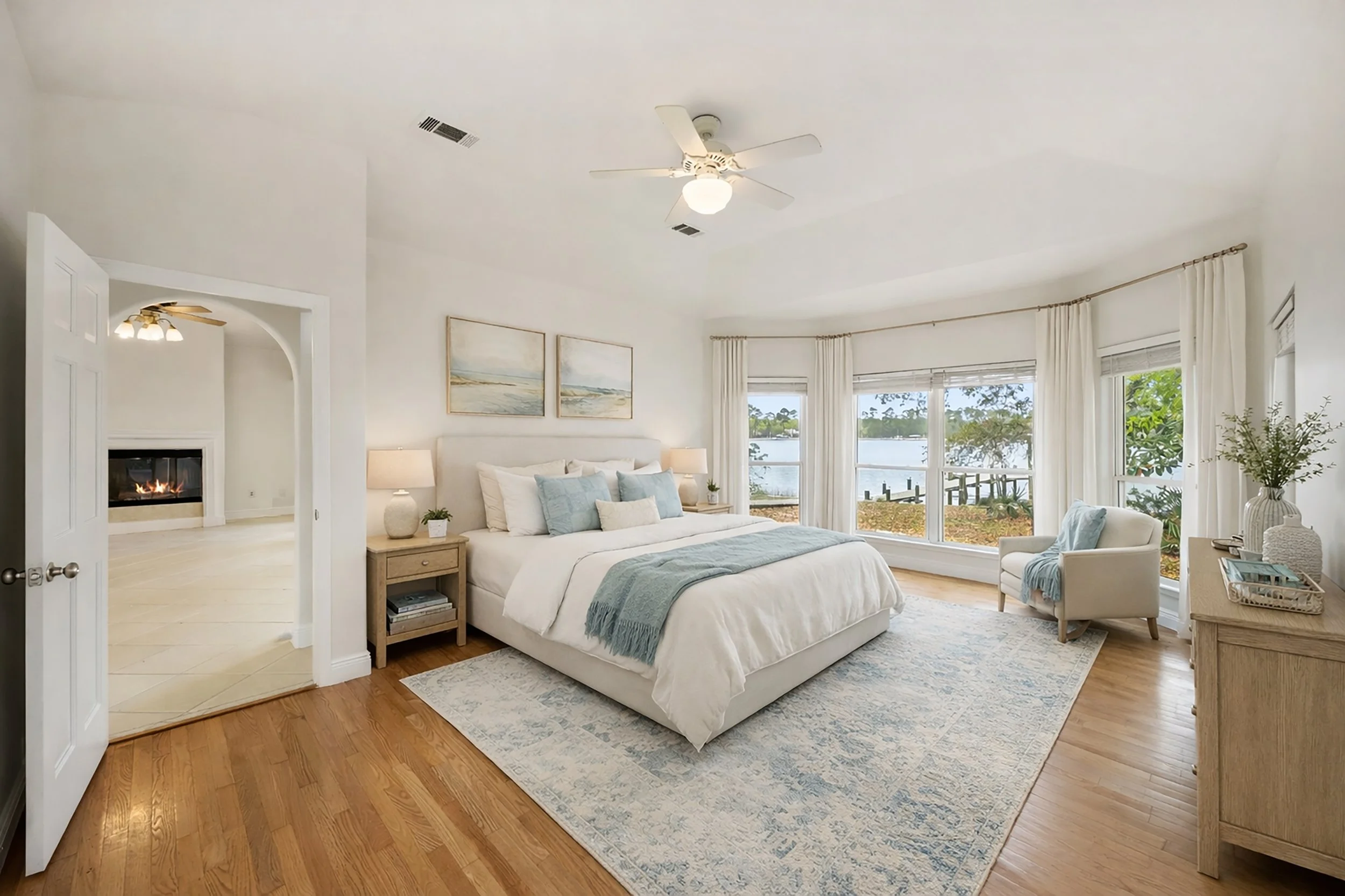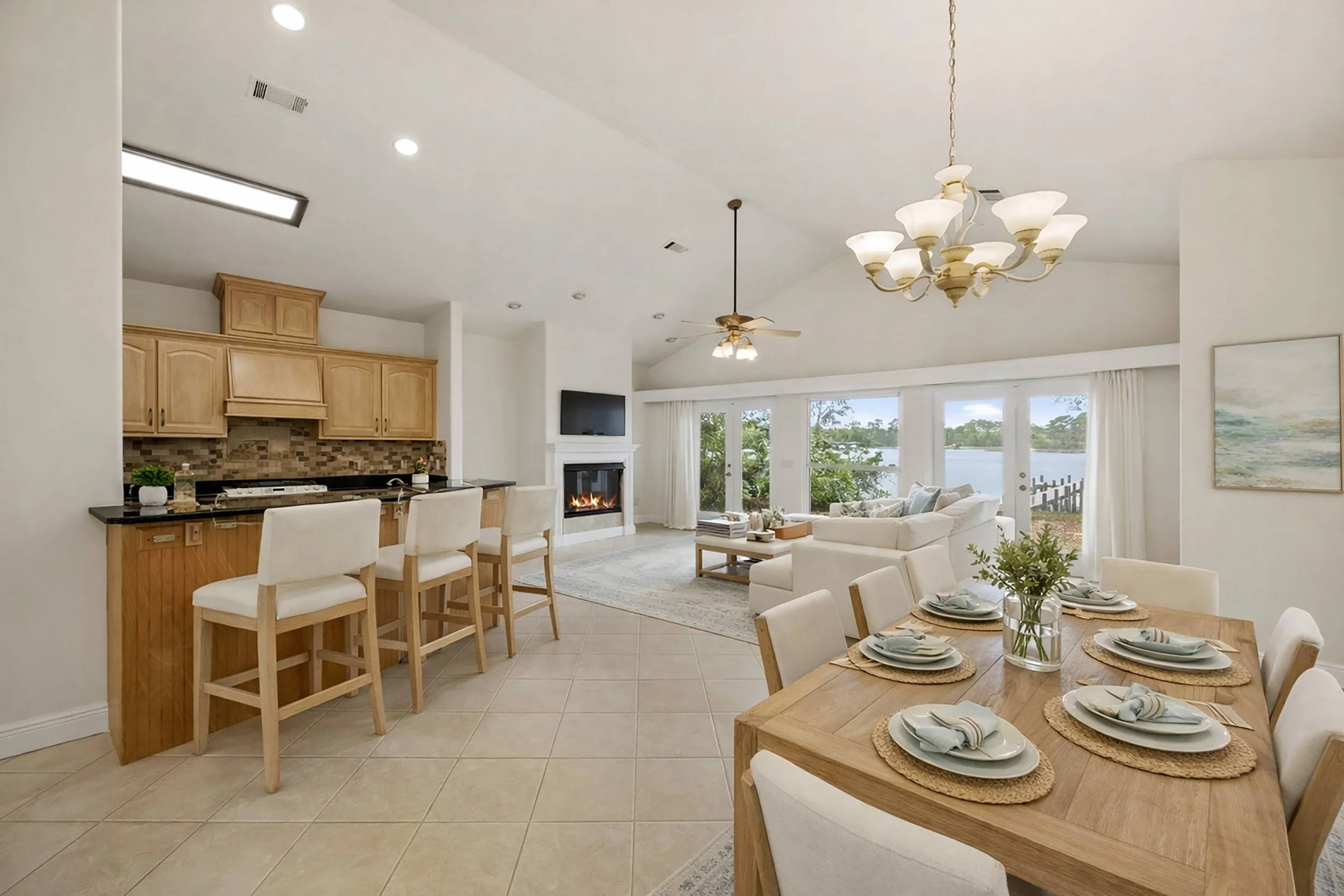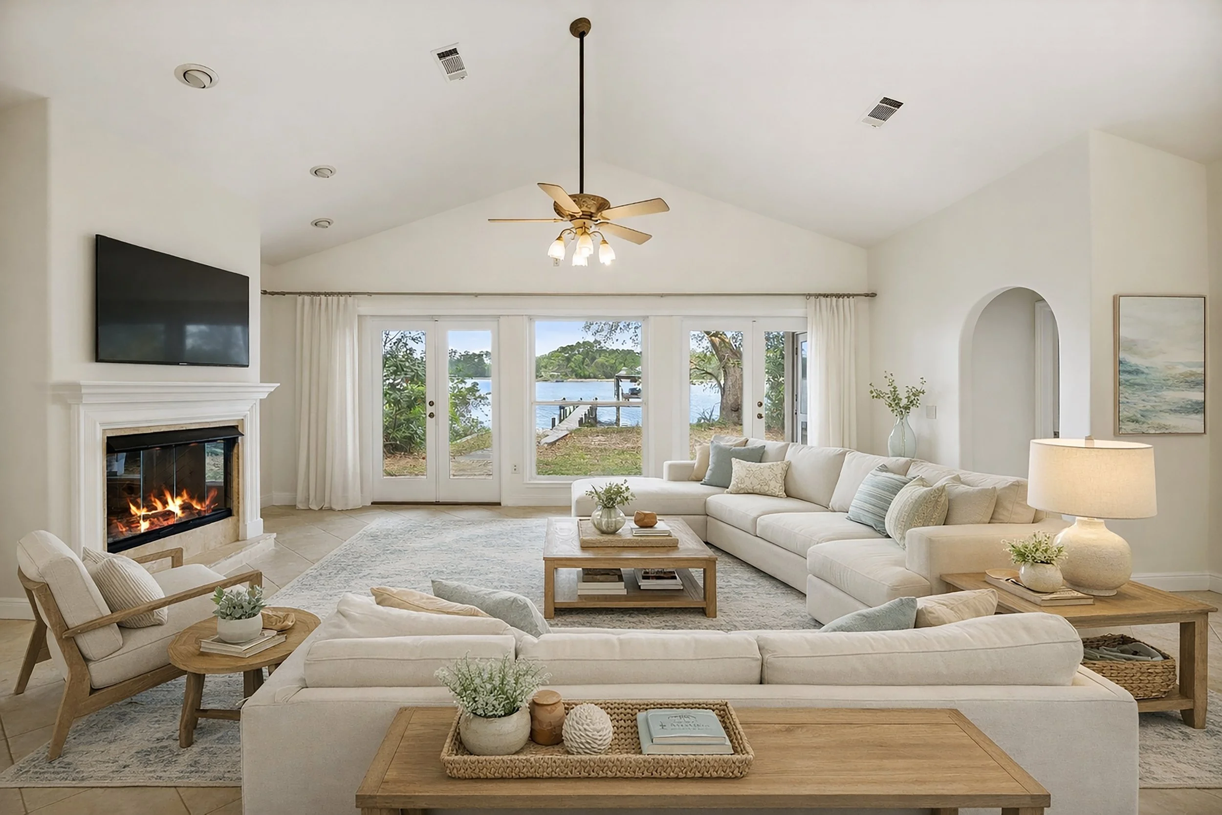Inside, the home is designed with a functional open layout and durable tiled flooring throughout the main living areas. The living room centers around a fireplace and is lined with windows that bring in natural light and showcase the water views. It’s a space that feels open, clean, and easy to live in.